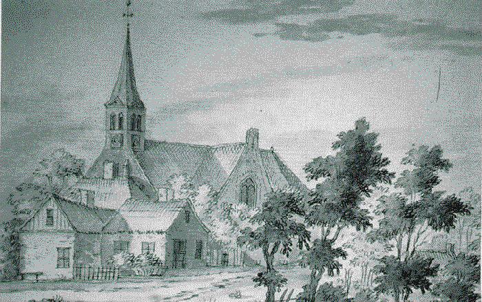 A pen-drawing of the former cruciform church at the Kerkepad, dated 1726 by J. Stellingwerf